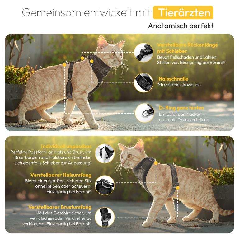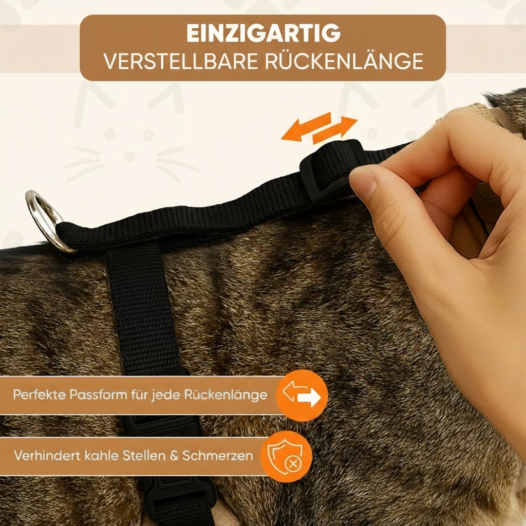 Ein wirklich gutes Katzengeschirr ist am Hals, am Brustumfang und an der Rückenlänge verstellbar. Nur so lässt sich das Geschirr exakt an den Körper deiner Katze anpassen – ohne Druckstellen und ohne Schlupf.