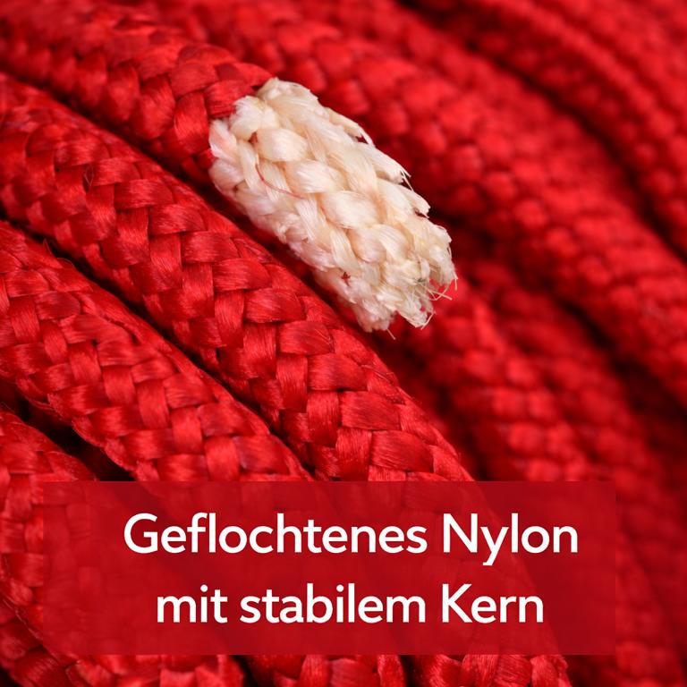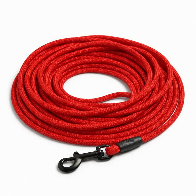 Die runde Flechtung sorgt für eine gleichmäßige Kraftverteilung und ein angenehmes Handling. Durch die kräftige rote Farbe bleibt die Leine auch im Gras oder auf Distanz gut sichtbar.